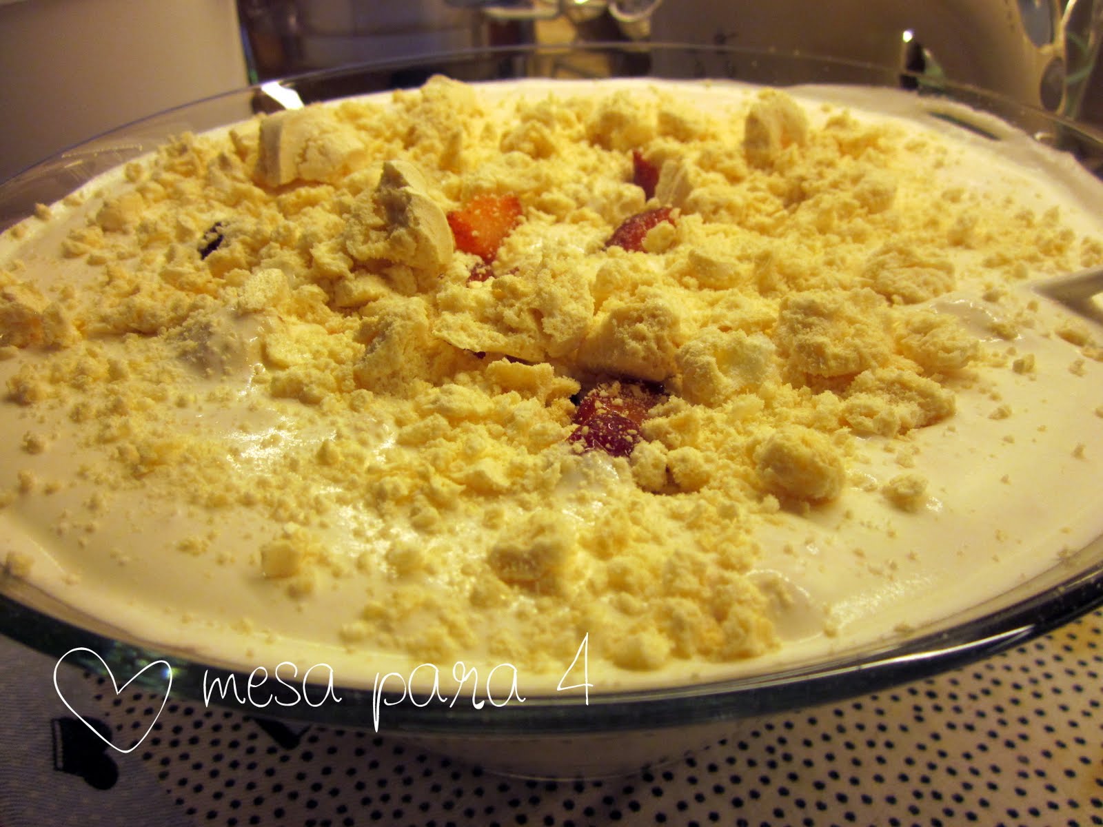 A receita é da Nigella, algures escrita num caderno, é óptima para fazer no verão mas, não pode ser feita com antecedência, é sobremesa para fazer e comer na hora, isto porque os suspiros derretem e a receita perde a graça.